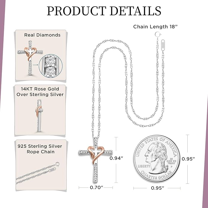 - Heavenly divine cross pendant in rose gold over sterling silver with 1/10 Cttw natural white diamonds hanging on a rope chain resembling palm Sunday