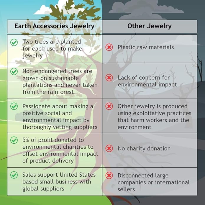 - Two trees are planted for each used in production of this jewelry. Trees are grown on sustainable plantations and never taken from rainforests. Don't overly expose wood to water or harsh chemicals. Use beeswax or mineral oil to keep wood looking new.
