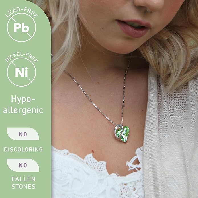 - Delicate Fashion Jewelry Gift that Fits - This woman’s necklace is adorned with a 0.75 x 0.88-inch light chrysolite green birthstone crystal for August. They are rhodium plated and designed with an 18-inch chain plus 2-inch extender, and a lobster claw clasp.