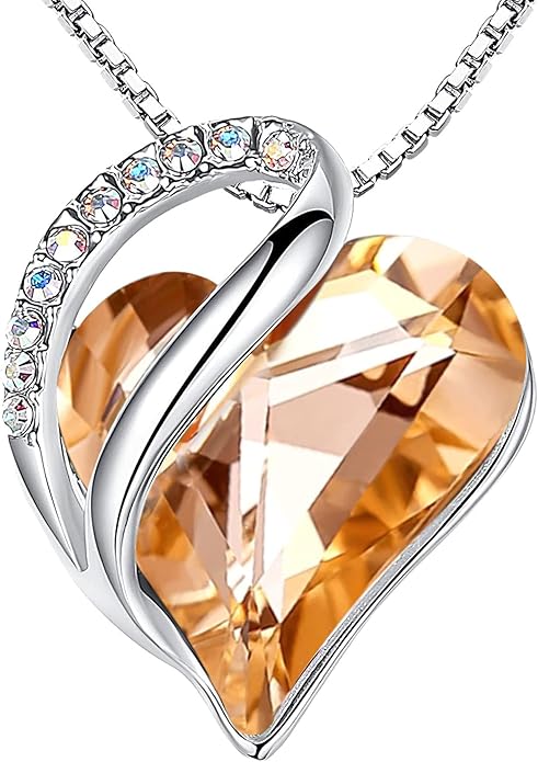 - Heart Necklaces with Birthstone Crystals - Our Infinity Love heart necklace for women is an original design from our studio in Boston and features a precious Austrian birthstone crystal. This classic yet innovative deisgn takes you across dimensions of time and space, the prosperity of life, and ultimately the triumph of love. It's a perfect gift for women !