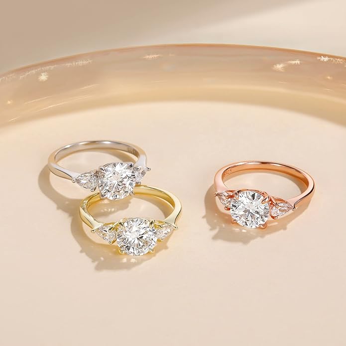 - Stylish: Captivating two pear-shaped stones brilliantly frame the center cushion stone in this classic three stone ring. The petite band gently tapers and secures the gems in a basket setting