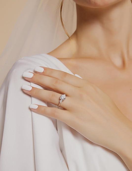 - Specification: Classic 3 stone ring set with brilliant cut cubic zirconia, this stunning fake wedding ring is crafted in sterling sliver, highly polished, never lose its luster