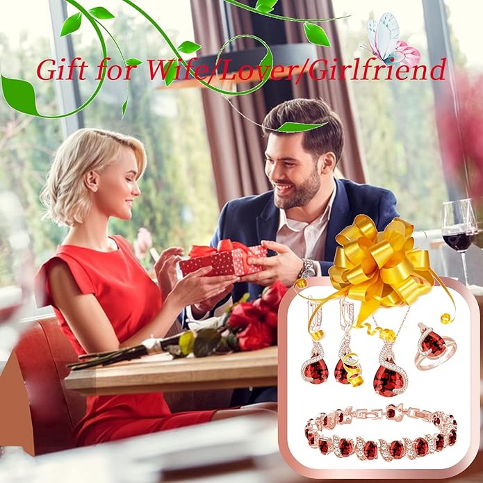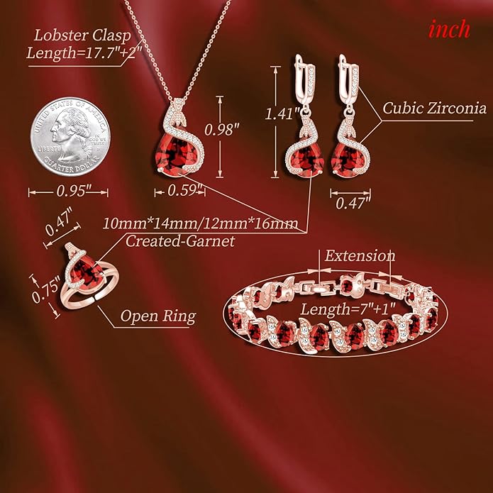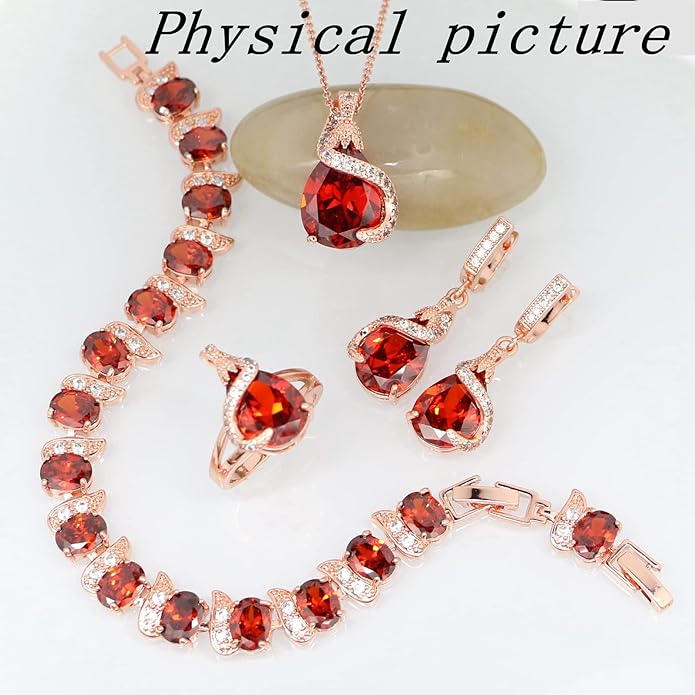 - ❤MATERIAL❤: This jewelry set is rose gold plated alloy, nickel-free, lead-free, non-allergic, and highly polished. The main stone is a 12mm*16mm (pendant) and 10mm*14mm (earrings and rings) teardrop created-garnet, and the side stones are multiple inlaid sparkling cubic zirconia. The bracelet contains 16 oval created-garnet and 32 round cubic zirconia.