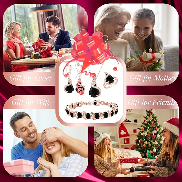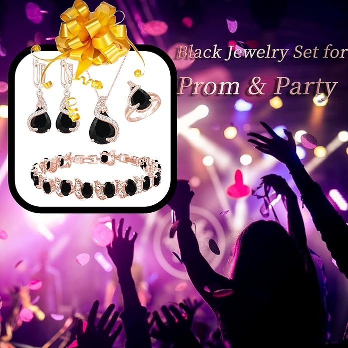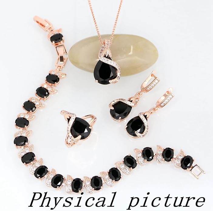 - ❤MATERIALS AND SPECIFICATIONS❤: This jewelry set is made of 18K rose gold plated alloy, highly polished, lead-free, nickel-free, and non-allergenic. The main stone is a waterdrop black cubic zirconia of 12mm*16mm (pendant) and 10mm*14mm (earrings and ring), and the side stones are multiple sparkling cubic zirconia. The bracelet contains 16 oval black cubic zirconia.