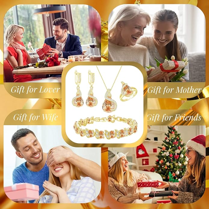 - ❤MATERIAL❤: This jewelry set is gold plated brass, highly polished,nickel-free, lead-free, non-allergic. The main stone is a teardrop Champagne cubic zirconia (16mm*12mm for pendant,14mm*12mm for ring/earrings,8mm*6mm for bracelet) and the side stone is sparkling cubic zirconia. These stones are durable, scratch-free, defect-free, and specially constructed to ensure they won't fall.