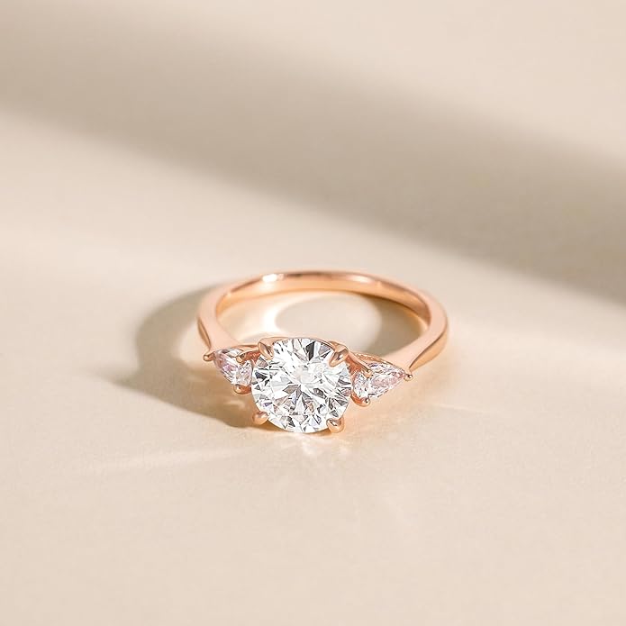 - Stylish: Captivating two pear-shaped stones brilliantly frame the center cushion stone in this classic three stone ring. The petite band gently tapers and secures the gems in a basket setting