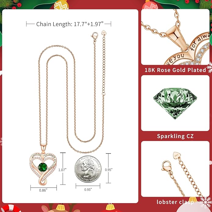 - 【18K Rose Gold Infinity Love Heart Necklace for Women】The heart birthstone necklace engraved “ I Love You for Always and Forever” features infinity double heart design to represents the endless love for your loved ones. And the pendant and chain are 18K rose gold plated. This love jewelry is a great gift for any woman on any special day, such as Birthday gifts for women, Anniversary gifts for women, Christmas gifts for women, Valentines’s Day, Mother’s Day, etc.