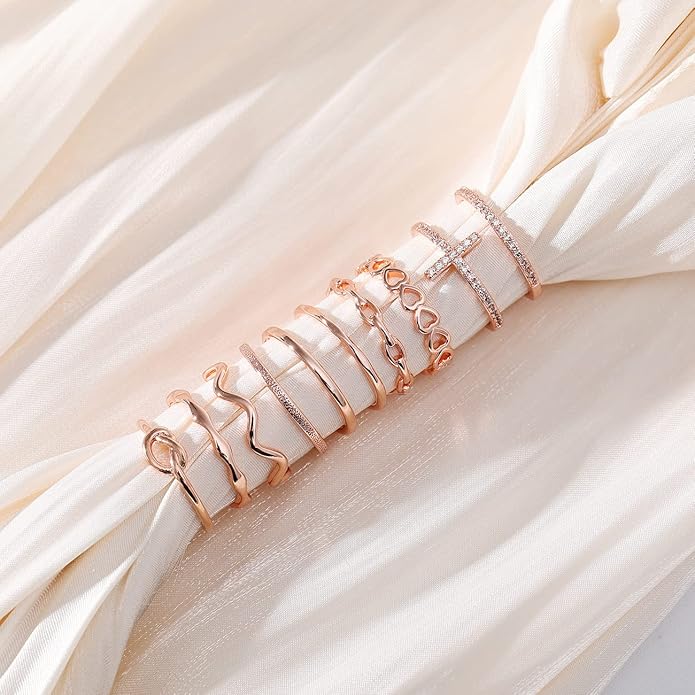 - Gold Thin Ring Set : 10 PCS classic ring sets with different designs, including wave rings, twisted rings, plain rings, matte plain rings, crystal rings, cubic zirconia cross rings, gold chain rings, Heart rings, etc. The styles are diverse enough to meet your different daily outfits. You can wear a single ring or stack it