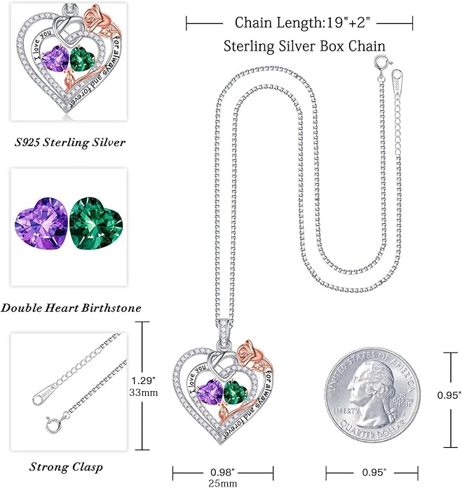 Iefil Rose Heart Necklace Gifts for Wife Women - 925 Sterling Silver Double Birthstone Necklace, Anniversary Birthday Gifts for Women, Jewelry Gift for Wife Girlfriend Mom Her