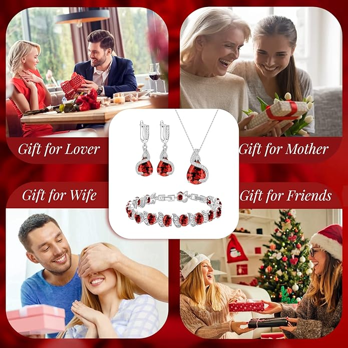 - ❤UNIQUE JEWELRY❤: GZWHD designer uses an graceful 3D "S"-shaped arc structure inlaid with shining cz to fix the 12mm*16mm(pendant)and 10mm*14mm(earrings)water drop red zircon. Tennis bracelet set with 16 pieces of 6mm*8mm oval cubic zirconia and 32 artificial crystals.The metal bracket is plated with white gold, lead-free, nickel-free, non-allergenic, shiny and will not change color, easy to maintain.