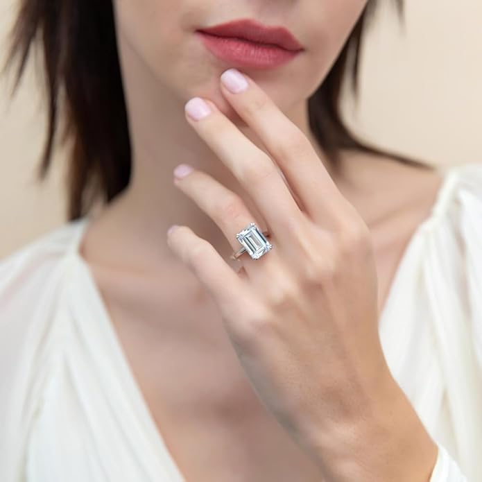 - NICKEL-FREE: Designed with your comfort in mind, safe for sensitive skin, won't turn your finger green. Features premium grade 8.5 carat emerald cut cubic zirconia CZ (14mm x 10mm). Measures 2.4mm band width, 7mm setting height.