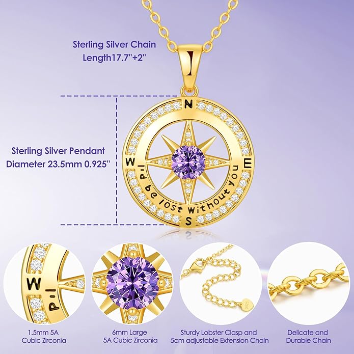 Compass Necklace Gifts for Women wife - S925 Sterling Silver Birthstone Necklaces for Women - Anniversary Birthday Gifts for Her Wife Girlfriend - Valentines Mom Mothers Day Christmas Gifts Jewelry for Women