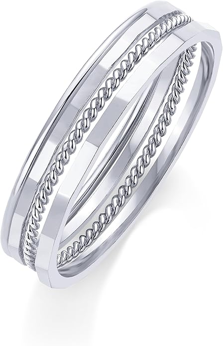 - Elevate your style with our versatile four ring pack, designed for the fashion-forward woman. This set includes a 0.8mm thin band for a touch of elegance, a 0.6mm thin faceted band that catches the light just right, a 0.8mm round twisted band for those who love a bit of texture, and a 1mm faceted band for a bolder statement. Perfect for stacking or wearing individually, these rings cater to all your fashion needs, from creating a minimalist look to embracing the stacked trend.