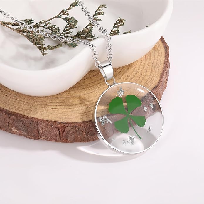 - 🍀Pendant Detail: Handmade item; Pendant height: 2.8 Centimeters; Pendant width: 2.8 Centimeters; Materials: 18K Silver Plated over brass,Real Four Leaf Clover, resin,silver flakes.Chain Detail:Stainless Silver Plated 18 inches and is perfect for everyday wear.