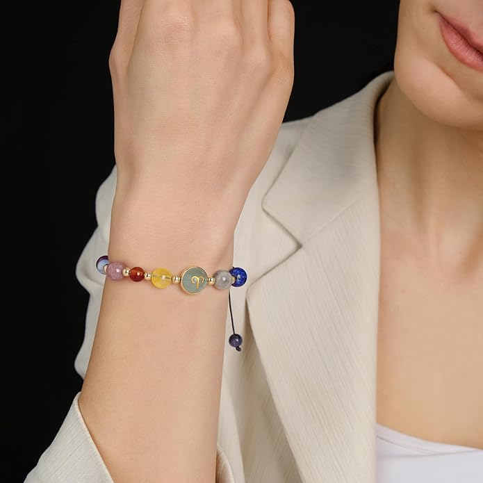 - 【Aries】The Aries birthstones - lapis lazuli,labradorite,Green aventurine,Citrine,Red agate,Strawberry quartz,Opal,Amethyst,White jade.the Nine crystal stones uniquely represent a zodiac sign, which each has its own healing effect and protection for the wearer, Also, Wearing this constellation stone bracelet will make you feel connected to the stars.