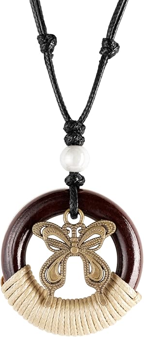 - NATURAL WOODEN RING PENDANT: This necklace features a dark, polished wooden ring, providing a rich, earthy base for the intricate butterfly charm. The combination of materials creates a harmonious balance between nature and craftsmanship.