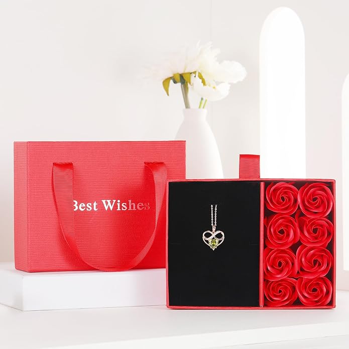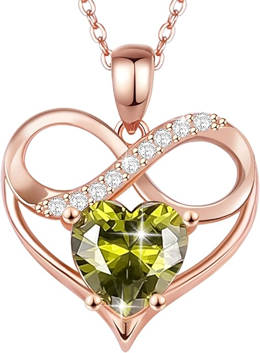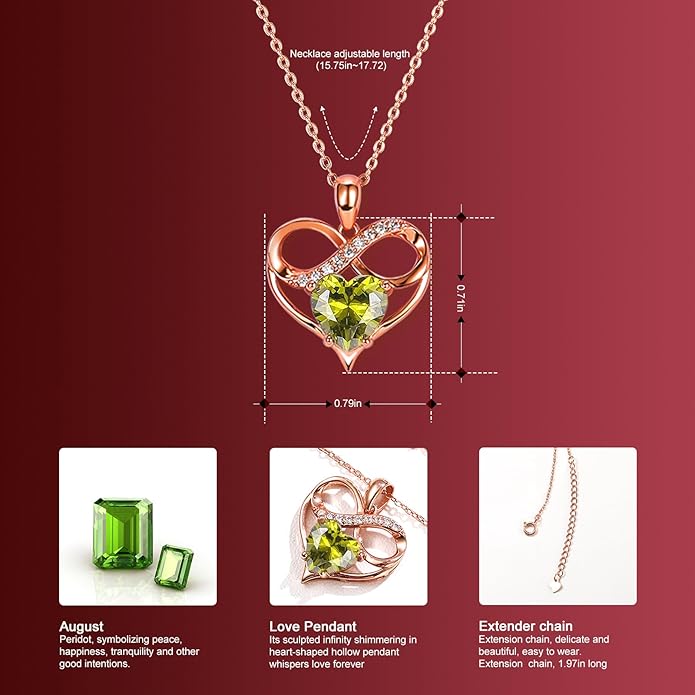 - A unique design mixed infinity and heart shape, make this heart birthstone necklace a unique jewelry gift for women. And Peridot is the birthstone of August, known as the " stone of happiness ", symbolizes happiness, peace, tranquility, and other good intentions. So this August birthstone necklace is a perfect birthday gift for wife, mom, girlfriend and also a lovely friend birthday gift for women.