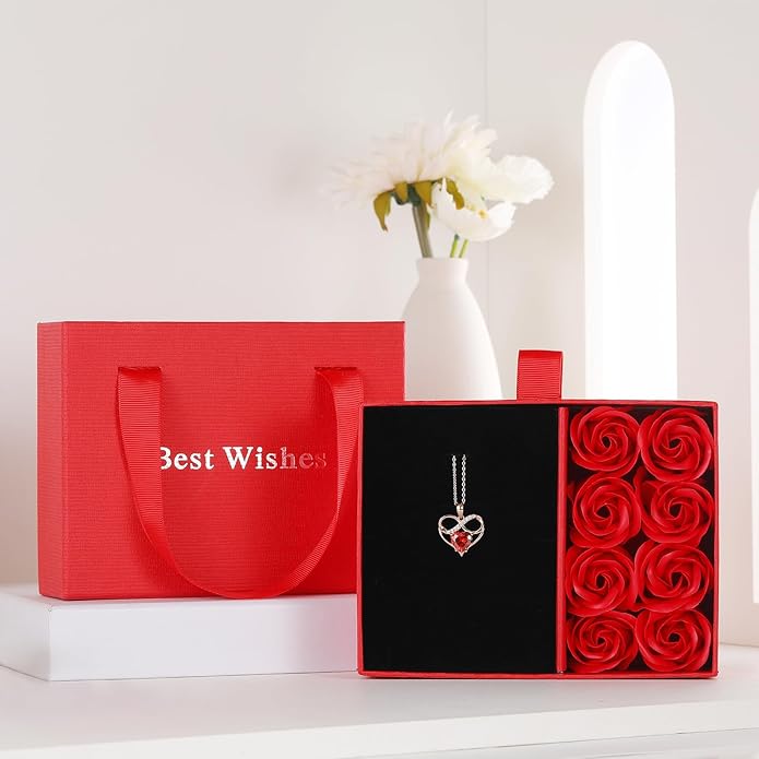 - A unique design mixed infinity and heart shape, make this heart birthstone necklace a unique jewelry gift for women. And Ruby is the birthstone of July, known as the "stone of love", symbolizes the fire of passion and the beauty, eternity, and steadfastness of love. So this July birthstone necklace is a perfect birthday gift for wife, mom, girlfriend and also a lovely friend birthday gift for women.