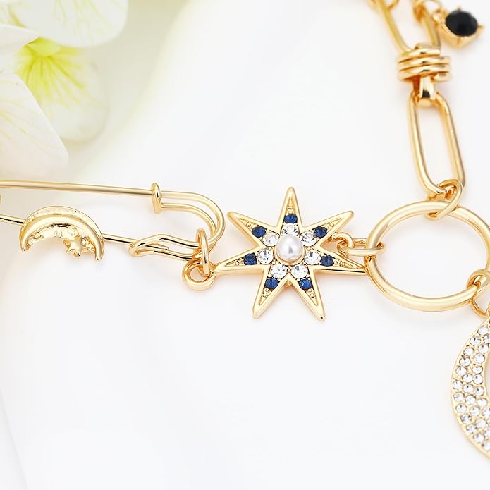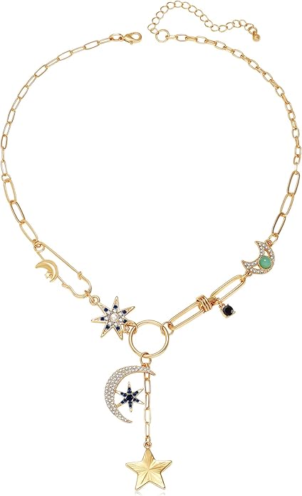 - CELESTIAL CHARMS Y NECKLACE: The gold pendant necklace is charm necklace with star and moon. A cat eye stone attached on the moon charm at the side, shiny in different angles; stylish and eye-catching