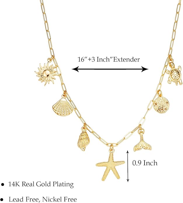 - Charm Necklace: Allow your style to embrace the ocean and flow through the golden waves on summer days. The paperclip chain is adorned with various delightful pendants of starfish, shells, conchs, suns, and turtles, each one captivating and the ideal accessory for your leisurely walks on picturesque beaches.