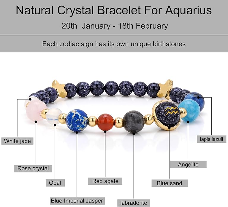 - 【Aquarius】The Aquarius birthstones - lapis lazuli,Angelite,Blue sand,labradorite,Red agate,Blue Imperial Jasper,Opal,Rose crystal,White jade.the Nine crystal stones uniquely represent a zodiac sign, which each has its own healing effect and protection for the wearer, Also, Wearing this constellation stone bracelet will make you feel connected to the stars.