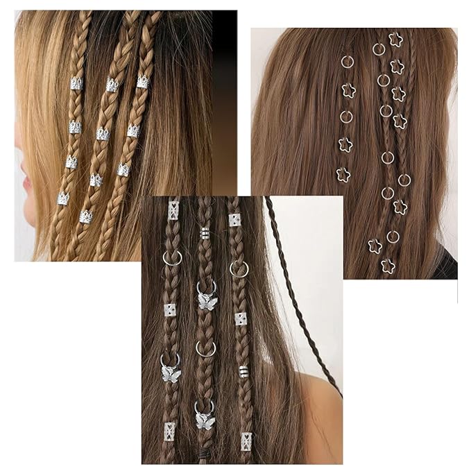 - 【Various Styles】: 200 pcs of silver braid hair charm including 10 styles, 30x hoop rings, 25 x silver crown,25 x silver heart ,25 x silver five-pointed star, 25 x hair extension plum flower, 20 x silver pattern X, 20 x silver double heart , 10 x silver spring,10 x silver butterfly charm and 10 x silver three layer cuff clips