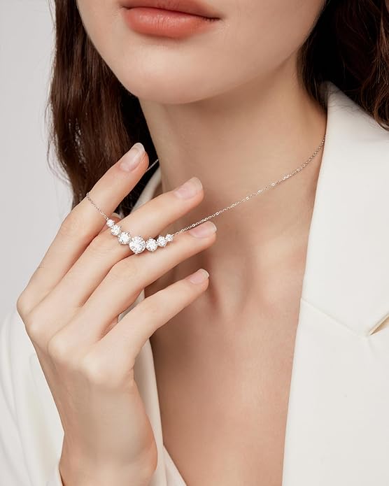 - 【Elegant Smile-Inspired Design】Inspired by the warmth of a genuine smile, this moissanite diamond necklace for women conveys a heartfelt message of love and unwavering commitment. The center is a stunning 1-carat moissanite. Each moissanite pendant radiates a dazzling brilliance, reflecting your profound love. This dainty necklace consists of 7 moissanite stones (1x3.0ct center stone,2x1.5ct,2x0.5ct,2x0.3ct), Total 7.6ct.