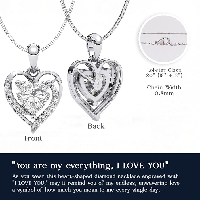 - ✨ I Love You Necklace: Our I love you Necklace is best a best gift for wife, girlfrienf and mom. Moissanite offers unmatched sparkle and fire, radiating more brilliance than diamonds, making this heart necklace an eye-catching piece. This silver necklace ensure it’s safe for sensitive skin, providing all-day comfort