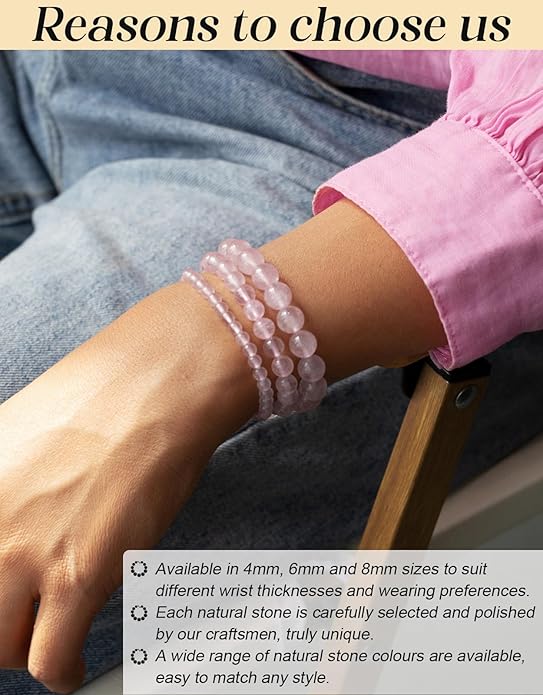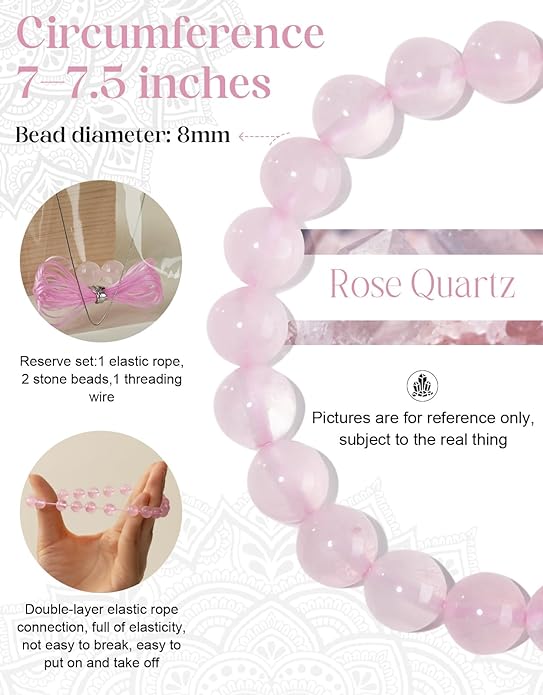 - 【Healing Bracelets】Considered the “stone of love”, Rose Quartz can help open the Heart Chakra, increase self-love and love for others, and improve relationships. It can also soothe emotional wounds and bring peace of mind, and when placed at the foot of the bed, it helps to relax the body and mind and improve the quality of sleep.