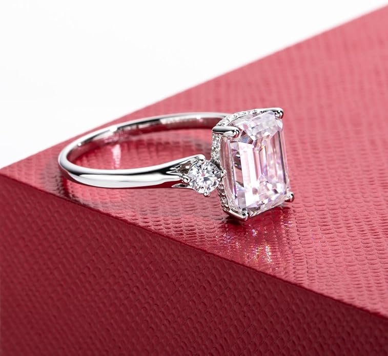 - 【CLASSIC DESIGN】A classic three stone ring silhouette is updated by a unique open gallery, allowing maximum light to reach the floating 3 carats emerald cut moissanite. A hidden halo of moissanites wraps the gallery wire in shining light (1/6 total carat weight), plus 2pcs 0.1 carat side moissanites, adding sparkle and flair.