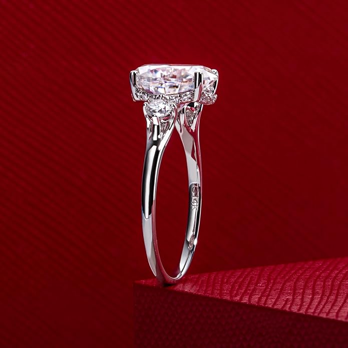 - 【CLASSIC DESIGN】A classic three stone ring silhouette is updated by a unique open gallery, allowing maximum light to reach the floating 3 carats oval cut moissanite. A hidden halo of moissanites wraps the gallery wire in shining light (1/6 total carat weight), plus 2pcs 0.1 carat side moissanites, adding sparkle and flair.