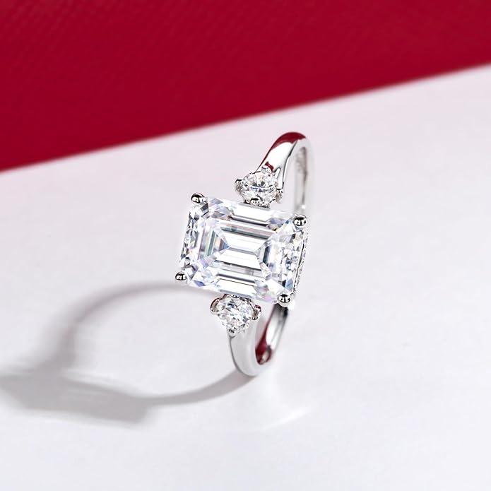 - 【CLASSIC DESIGN】A classic three stone ring silhouette is updated by a unique open gallery, allowing maximum light to reach the floating 3 carats emerald cut moissanite. A hidden halo of moissanites wraps the gallery wire in shining light (1/6 total carat weight), plus 2pcs 0.1 carat side moissanites, adding sparkle and flair.