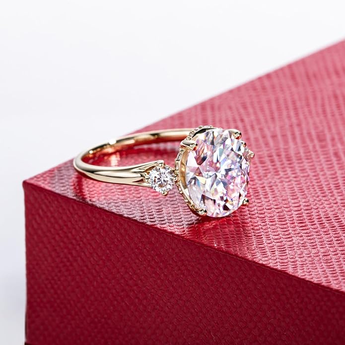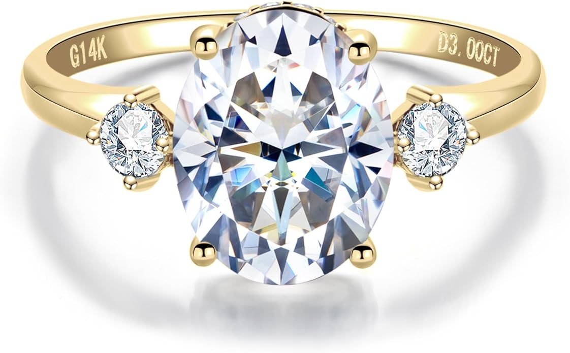 - 【CLASSIC DESIGN】A classic three stone ring silhouette is updated by a unique open gallery, allowing maximum light to reach the floating 3 carats oval cut moissanite. A hidden halo of moissanites wraps the gallery wire in shining light (1/6 total carat weight), plus 2pcs 0.1 carat side moissanites, adding sparkle and flair.