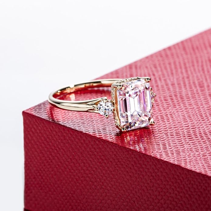- 【CLASSIC DESIGN】A classic three stone ring silhouette is updated by a unique open gallery, allowing maximum light to reach the floating 3 carats emerald cut moissanite. A hidden halo of moissanites wraps the gallery wire in shining light (1/6 total carat weight), plus 2pcs 0.1 carat side moissanites, adding sparkle and flair.