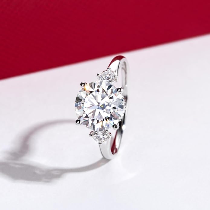 - 【CLASSIC DESIGN】A classic three stone ring silhouette is updated by a unique open gallery, allowing maximum light to reach the floating 3 carats round brilliant cut moissanite. A hidden halo of moissanites wraps the gallery wire in shining light (1/6 total carat weight), plus 2pcs 0.1 carat side moissanites, adding sparkle and flair.