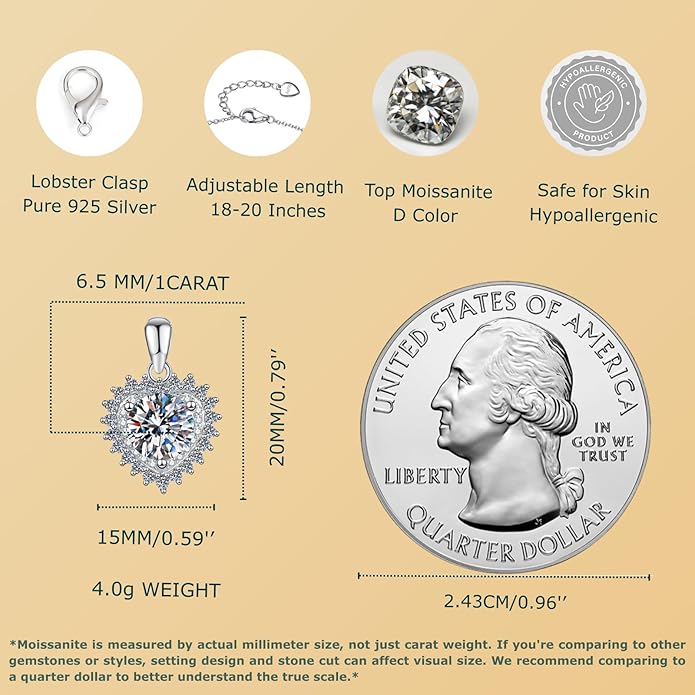 - β¨HYPOALLERGENIC 925 STERLING SILVER - Safe for All Skin Types: Crafted from premium 925 sterling silver, this moissanite necklace for women is hypoallergenic, ensuring it won't cause any irritation or discomfort, even for those with sensitive skin. The silver material is also highly durable, resistant to tarnish and corrosion, so your necklace will maintain its shine for years to come.