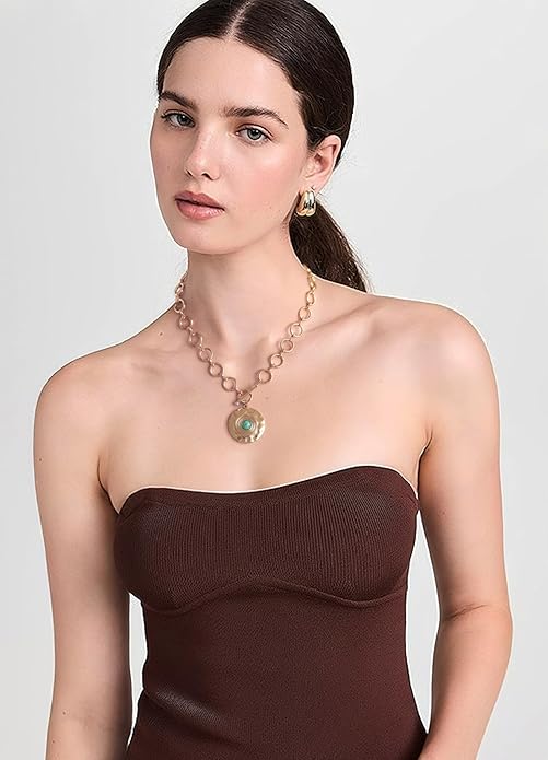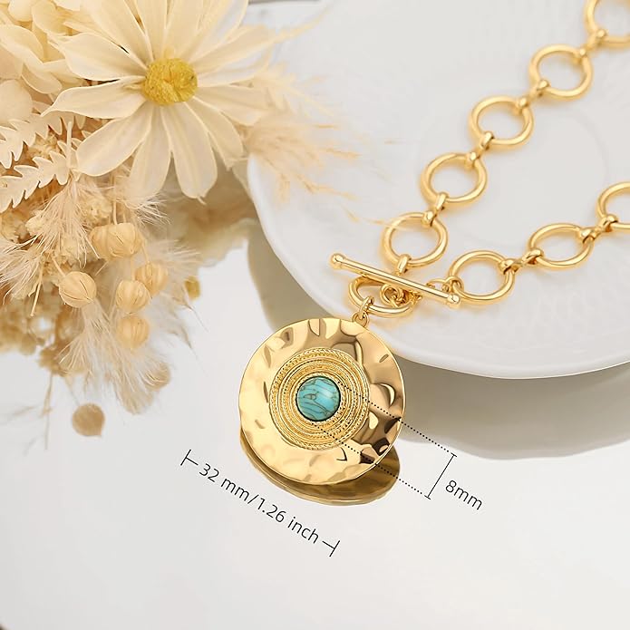 - 1.STYLE: This large pendant necklace features a big, hammered gold medallion, combining the ancient charm of turquoise with the bold elegance of a statement necklace for women. The unique design make it an eye-catching addition, perfect for those who love coin necklaces or big gold necklaces.