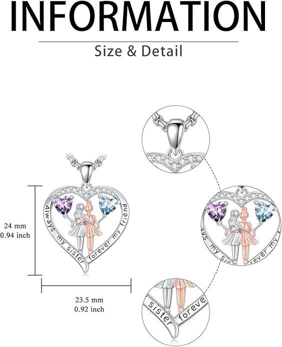 • Sister Pendant - Heart Birthstone Gifts for Women --- This exquisite sister necklace features a heart-shaped birthstone stone that is 2X bigger than competitors'. As you might expect, the pendant is a big one, not in dainty style. However, the recipient will not be disappointed, as the actual necklace is truly captivating.