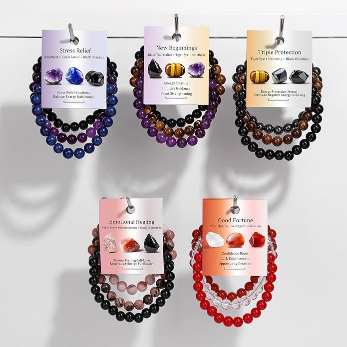 Healing Crystal Bracelets for Women Men 8mm Tiger Eye Hematite Black Obsidian Natural Stone Beaded Stretch Bracelet Triple Protection Handmade Gemstone Reiki Spiritual Jewelry Gifts