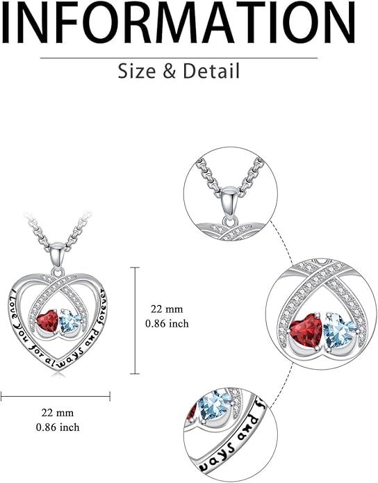• 12 Colors of Birthstones for 12 Months --- The I love for always and forever necklace as a birthday ideas jewelry gift to her. Garnet stone for Jan, Amethyst for Feb, Aquamarine for March, Diamond for Apr, Emerald for May, Alexandrite for June, Ruby for July, Peridot for Aug, Sapphire for Sept, Pink for Oct, Citrine for Nov, Turquoise for Dec.