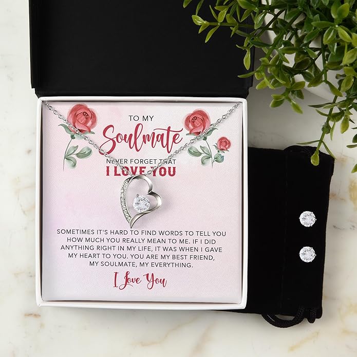 (USA-Assembled) To My Soulmate Gift - Womens Heart Necklace and Earring Set for Her Jewelry - Wedding Anniversary Valentines Day Birthday Engagement Christams Black Box (id161)